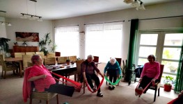 Při pondělku příjemná dávka protahovacích cviků na židli a dnes s pryžovou gumou. každý pohyb se počítá, ještě si dáme menší procházku v naší hezké zahradě.