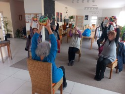 Zahajujeme týden cvičením na židlích - tentokrát nám posloužila pomůcka posilovací gumička. Ta je skvělá na posílení paží a nohou.