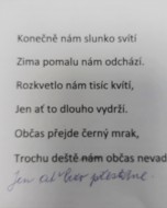 V neděli slaví narozeniny paní Jana. Popřáli jsme jí mezi dveřmi už dnes. Přejeme všechno nejlepší, pevné zdraví, štěstí a příjemné bydlení ![]()