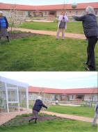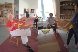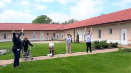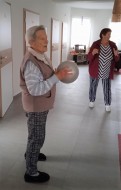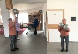Konečně přestalo pršet a my můžeme zacvičit v atriu. Dnes jsme zkusili rehabilitační míčky, které byli velmi zajímavé i pro našeho čtyřnohého obyvatele, který tu bydlí se svou paničkou.