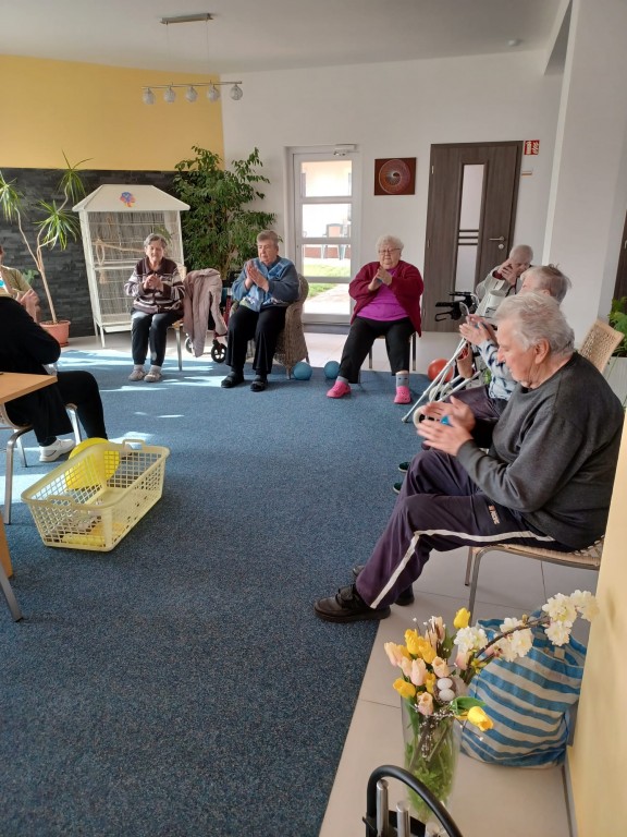 Po víkendu se opět scházíme s naší hospodyňkou Andrejkou u cvičení na židlích. Každý pohyb se počítá k dobru a my to dobře víme.