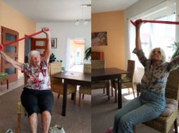 Nový týden začínáme tradičním cvičením na židlích. Tentokrát jsme použili gumovou cvičební pomůcku, která je na protahování přímo skvělá. Zkoušeli jste?