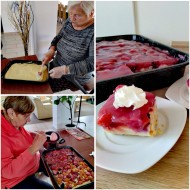 A jde se péct ovocná buchta s červenou želatinou. Před podávání ozdobíme velkým kopcem šlehačky a všichni si pochvalovali.