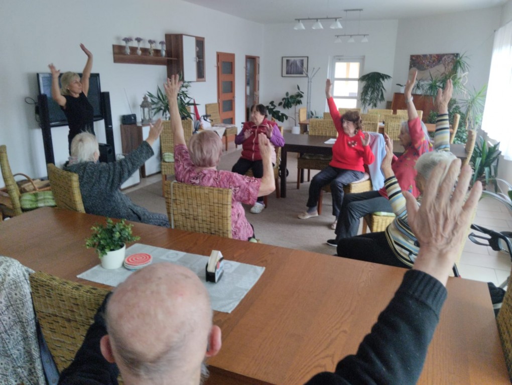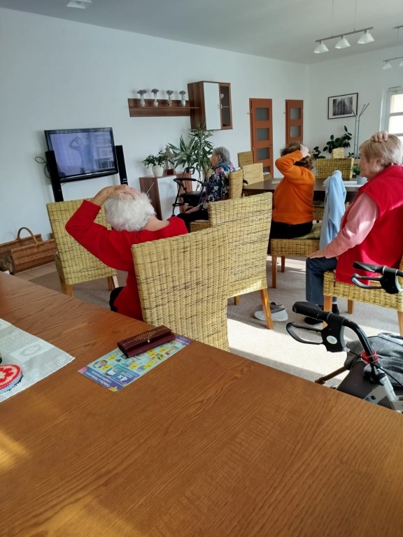 Při pondělku příjemná dávka protahovacích cviků na židli a dnes s pryžovou gumou. každý pohyb se počítá, ještě si dáme menší procházku v naší hezké zahradě.
